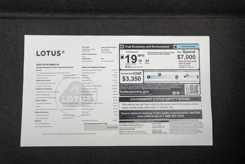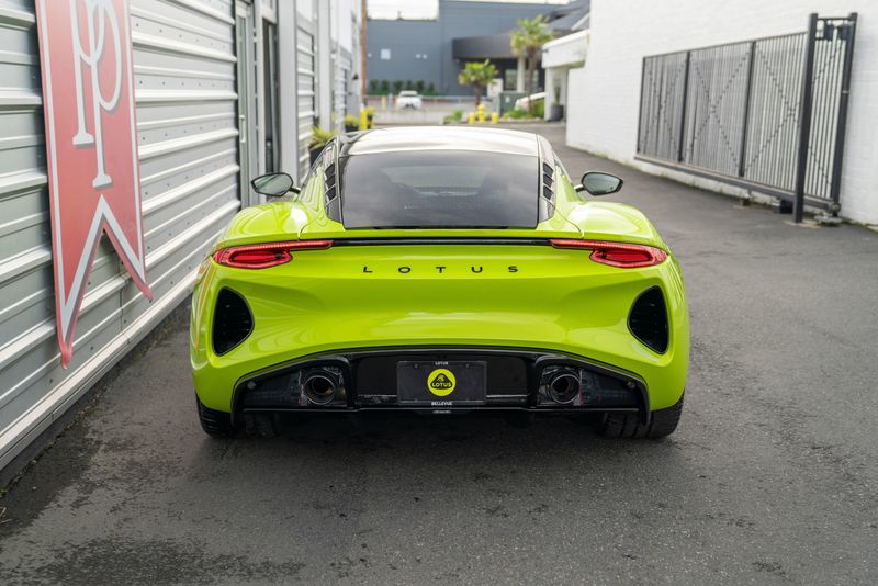 *2025 Lotus Emira Chapman Bespoke Edition* * Isotope Green Over Black Leather/Alcantara Interior * 1 of 60 Built, 6-Speed Manual, Sport Suspension, Heritage Color*Chapman Bespoke Edition Features* * 1 of 60 Produced * Istotope Green Paint * Elise and Exige Color * Special Interior/Exterior Badging * Sport Suspension * Michelin Pilot Sport Cup 2 Tires * Full Black Pack * Gloss Black Roof Panel * Cantrails * Mirror Backs * Front Air Blades * Front Splitter * Side Sills * Rear Diffuser * Exhaust Tailpipe Finishers * Rear Lotus Badge * KEF Audio * Sport Pedals * Black Alcantara Steering Wheel * Black Alcantara Headliner * Privacy Glass * Black Calipers * Gloss Black Forged Wheels*Additional Information* * Factory Warranty in effect through April/2029 or 36k miles.*Standard Features* * 3.5-Liter Supercharged V6 * 400 Horsepower * 317 Lb-Ft of Torque * Edelbrock 1740 Supercharger * 6-Speed Manual Transaxle * Lotus-Designed and Manufactured Bonded Aluminum Chassis * Blade Design Daytime Running Lamps * C-Shaped LED Taillights * Lightweight High Performance 2-Piece Brake Discs * Bilstein Monotube Dampers * 12-Way Adjustable Heated Seats * KEF Uni-Q Premium Audio * 560 Watts * Wireless Apple CarPlay and Android Auto * 12.3-Inch TFT Instrument Display * 10.25-Inch HMI Touchscreen * Dual-Zone Climate Control * Electronic Monitoring System * Driver and Passenger Airbags * Inflatable Curtain Airbags * Seat Belt Pre-TensionFor more information on this 2025 Lotus Emira V6 Chapman Bespoke Edition or any of our High-Performance, Luxury, Exotic, and Special Interest cars always in stock, contact one of our friendly and knowledgeable sales consultants or always feel free to drop by our 40,000+ sq ft of Indoor Showrooms in Bellevue, WA - Home of an Exciting Inventory of Luxury, Exotic, High Performance and Collectible Automobiles. Nobody Has What We Have!
